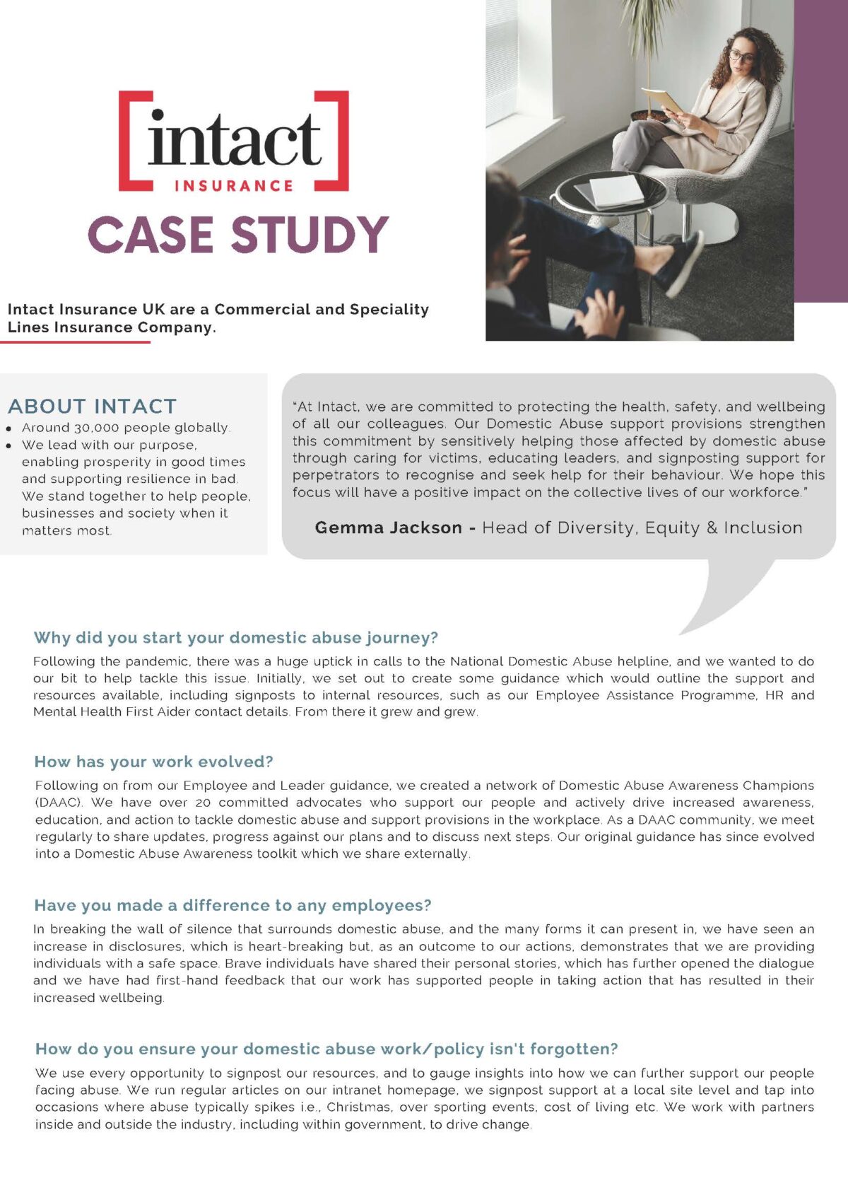 With around 30,000 employees globally, Intact Insurance is committed to supporting its people. They’ve introduced a Domestic Abuse Policy, trained Domestic Abuse Awareness Champions, and ensured employees have a safe space to seek support.